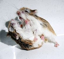 Hamsters have poor eyesight; they are nearsighted and colorblind.[12][13] Their eyesight leads to them not having a good sense of distance or knowing where they are at. Even though their eyesight isn't good it doesn't stop a hamster from climbing their cages or even from them being adventurous. Hamsters can sense movement around at all times. This sense helps them protect themselves from harm in the wild but in a household situation it helps them sense when their owner may be near and might be going to pick them up.[14] Hamsters have scent glands on their flanks (and abdomens in Chinese and dwarf hamsters) which they rub against the substrate, leaving a scent trail.[15] Hamsters also use their sense of smell to distinguish between the sexes, and to locate food. Mother hamsters can also use their sense of smell to find their own babies and find out which ones aren't theirs. The scent glands can also be used to mark their territories, their babies, or their mate.[16] Hamsters catch sounds by having their ears upright. They tend to learn similar noises and begin to know the sound of their food and even their owners voice.[14] They are also particularly sensitive to high-pitched noises and can hear and communicate in the ultrasonic range.[7]