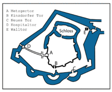 At the end of the 16th century, Count Philipp Ludwig II attracted Protestant refugees from the Netherlands and France to found their own settlement south of Hanau.[3] This was of high economic interest for him because these Walloons brought high-class trade, their knowledge of jewellery and other production of luxury items and therefore taxes to his county. Out of this tradition, goldsmiths are still trained in Hanau. Hanau also was the site of the first workshop to produce Faience within Germany. These new citizens were granted privileges and they formed their own community, church and administration for the "new town of Hanau" (Neustadt Hanau) wholly separate from the existing community. It took more than 200 years to amalgamate both. The new town – larger than the old one – was protected by a then very modern fortification in Baroque-style which proved a big asset only a few years later in the Thirty Years' War. The town survived a siege in 1637 with only minor damage.