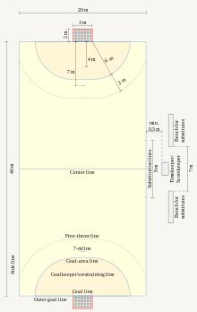 Each team consists of seven players on court and seven substitute players on the bench. One player on the court must be the designated goalkeeper, differing in his clothing from the rest of the field players. Substitution of players can be done in any number and at any time during game play. An exchange takes place over the substitution line. A prior notification of the referees is not necessary.