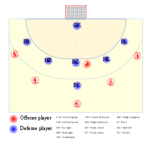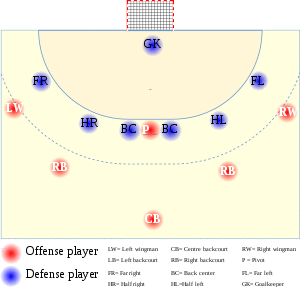 - Left and right wingman. These typically are fast players who excel at ball control and wide jumps from the outside of the goal perimeter in order to get into a better shooting angle at the goal. Teams usually try to occupy the left position with a right-handed player and vice versa.