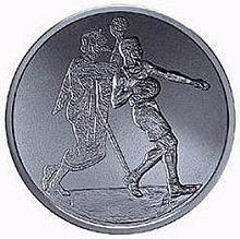 Handball events have been selected as a main motif in numerous collectors' coins. One of the recent samples is the €10 Greek Handball commemorative coin, minted in 2003 to commemorate the 2004 Summer Olympics. On the coin, the modern athlete directs the ball in his hands towards his target, while in the background the ancient athlete is just about to throw a ball, in a game known as cheirosphaira, in a representation taken from a black-figure pottery vase of the Archaic period.[24]