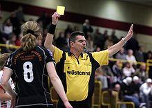 The IHF defines 18 hand signals for quick visual communication with players and officials. The signal for warning is accompanied by a yellow card.[13] A disqualification for the game is indicated by a red card,[14] followed by a blue card if the disqualification will be accompanied by a report.[15] The referees also use whistle blows to indicate infractions or to restart the play.