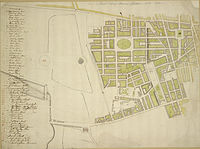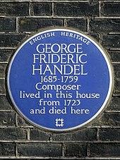 Handel acquired 25 Brook Street in the summer of 1723, shortly after having been appointed by George II as composer to the Chapel Royal, for which he was paid £400 per annum. The house had been newly built with Nos. 23, 27/29 and 31 by George Barnes as part of the planned extension of Brook Street, linking Hanover Square with Grosvenor Square, between 1717 and 1726. Originally, as a foreign national, Handel was not eligible to buy or take long-term leases on property in London; and even when he acquired British nationality in 1727, Handel continued renting the property on short-term leases. The fact that he remained there for the rest of his life, almost 40 years, is remarkable, since opera composers at the time were rarely of fixed abode; prior to that, Handel had been lodged in the homes of friends and patrons. At the age of 38, Handel had become accepted within the higher echelons of British society, with whom he freely mixed. His immediate neighbours on either side were from the upper middle classes and initially included the Member of Parliament, John Monckton, who later became the first Viscount Galway in 1727.[2] The layout of the rooms followed the conventions for a modest Georgian townhouse: the basement contained the kitchens; on each of the three floors above, there was a front room and a smaller back room with an adjacent closet; under the roof were garrets for servants.[3]