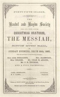 The society has performed Handel's Messiah annually since 1854. It gave the first United States performances of Verdi's Requiem in 1878, just four years after its world premiere,[36] and of Handel's Joshua on Easter Sunday 1876.[37] The first works by American composers appeared in the society's 1874 programs: St. Peter by John Knowles Paine and the Forty-sixth Psalm by Dudley Buck.[38] In 1892, the society presented the premiere of the Mass in E flat by Amy Beach, a youthful work by the first important female American composer.[39] Critics condemned the H+H performance of the Berlioz Te Deum in 1888 as the work of "a musical crank".[40]