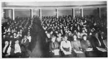 To mark the arrival of the twentieth century, 200 members of the H+H chorus participated in a midnight ceremony at the Massachusetts State House on December 31, 1899, leading the singing of "Old One Hundredth" and "America".[46] The society performed for the first time in Boston's Symphony Hall on October 21, 1900.[24] In the new century, as musical tastes changed and other professional groups competed for the same audience, H+H reduced its performances to four annually and avoided innovative repertoire choices. Occasionally a concert took on the flavor of a "pops concert", with sentimental vocal solos including Arthur Sullivan's "The Lost Chord", even as the society's president lamented how the public was distracted from concert-going "in these days of radio and victrolas."[47]