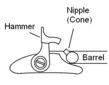 The caplock mechanism consists of a hammer, similar to the hammer used in a flintlock, and a nipple (sometimes referred to as a "cone"), which holds a small percussion cap. The nipple contains a tube which goes into the barrel. The percussion cap contains a chemical compound called mercury fulminate or fulminate of mercury, whose chemical formula is Hg(ONC)2.[14] It is made from mercury, nitric acid and alcohol. When the trigger releases the hammer, it strikes the cap, causing the mercuric fulminate to explode. The flames from this explosion travel down the tube in the nipple and enter the barrel, where they ignite the main powder charge.[14]