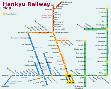 Hankyu Corporation (阪急電鉄株式会社, Hankyū Dentetsu Kabushiki-gaisha, lit. "Hankyu Electric Railway Stock Company") is a Japanese private railway operator that provides commuter and interurban service to the northern Kansai region and is one of major businesses operated by Hankyu Hanshin Holdings Inc., in turn part of the Hankyu Hanshin Toho Group (which includes H2O Retailing Corporation and Toho Co., the creator of Godzilla). The railway's main terminal is at Umeda Station in Osaka. The signature color of Hankyu cars is maroon.[1]