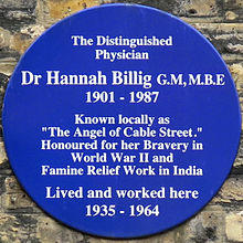 Hannah Billig, MBE GM (4 October 1901 – 11 July 1987) was a British doctor who worked in the East End of London. Billig was popular among her patients and her exceptional medical work during the Second World War earned her honours and awards, as well as the nickname "The Angel of Cable Street". After the war, she resumed her medical practice on Cable Street before retiring to Israel, continuing her medical work there until her death.
