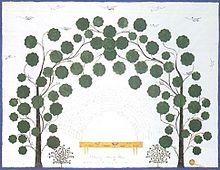 - A Bower of Mulberry Trees, 1854[2] was made as a result of Cohoon's vision of a feast of cakes by Shaker elders under mulberry trees.[17] The depiction of the long table in the drawing represents holy feasts held in biennial meetings and the presence of the doves overhead represents the bounties that the believer would experience in heaven.[18] Germaine Greer, author of The Obstacle Race: The Fortunes of Women Painters and Their Work, likened Cohoon's drawing to primitive art by Catholic artists of "an earthly paradise with trees in flower and fruit.[17]