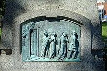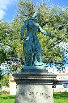 Duston's captivity narrative became famous more than 100 years after she died. During the 19th century, she was referred to as a folk hero and the "mother of the American tradition of scalp-hunting."[4] Some scholars assert Duston's story became legend in the 19th century only because the United States used her story to defend its violence against Native Americans as innocent, defensive, and virtuous.[5] Duston is believed to be the first American woman honored with a statue.[6][7][8][9][10][11]