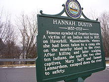 Hannah Duston (also spelled Dustin, Dustan, or Durstan) (born Hannah Emerson, December 23, 1657 – March 6, 1736,[1] 1737 or 1738[2]) was a colonial Massachusetts Puritan mother of nine[Note 1] who was taken captive by Abenaki people from Québec during King William's War, with her newborn daughter, during the Raid on Haverhill in 1697, in which 27 colonists were killed. While detained on an island in the Merrimack River in present-day Boscawen, New Hampshire, she killed and scalped ten of the Native American family members holding them hostage, with the assistance of two other captives. She claimed the Abenaki had killed her baby during the journey to the island.