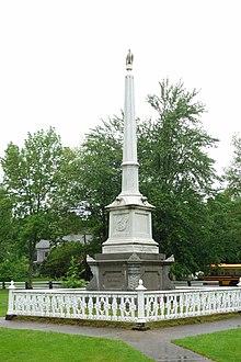 The campaign to build the first monument in Haverhill, Massachusetts, began in 1852, at a time when building public monuments was still a somewhat rare occurrence. The monument chosen was a simple marble column that would cost about $1,350, and by 1861 the necessary funds had been raised. On its base was a shield, surrounded by a musket, bow, arrows, tomahawk, and scalping knife. Engravings on its sides told the story of the "barbarous" murder of Duston’s baby and her "remarkable exploit;" the column was topped by an eagle.[16] The monument was erected on June 1, 1861, at the site of Duston's capture, but it was never fully paid for. Some subscribers were upset that the monument was in the middle of farmland on the outskirts of town instead of Haverhill Common. After successfully suing the association, the builders quietly removed the monument in August 1865, erased the inscription, engraved a new one, and resold it to the town of Barre, Massachusetts, where it stands to this day as a memorial to that town's Civil War soldiers.[24][5][60]