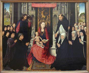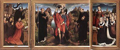 Hans Memling (also spelled Memlinc; c. 1430 – 11 August 1494) was a painter active in Flanders, who worked in the tradition of Early Netherlandish painting. He was born in the Middle Rhine region, and probably spent his childhood in Mainz. He moved to the Netherlands and spent time in the Brussels workshop of Rogier van der Weyden. He was subsequently made a citizen of Bruges in 1465, where he became one of the leading artists, running a large workshop, which painted religious works that often incorporated donor portraits of his wealthy patrons. Memling's patrons included burghers (bankers, merchants, and politicians), clergymen, and aristocrats.[2]