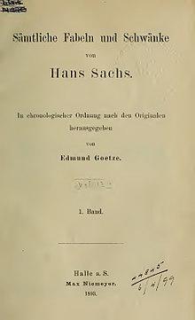 - Sachs, Hans (1893). Sämtliche Fabeln und Schwänke. 1. Halle a. S.: Max Niemeyer.