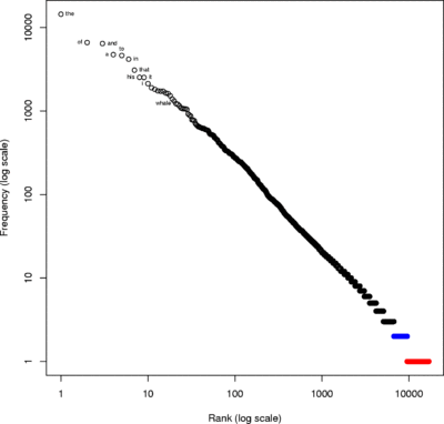 Hapax legomena are quite common, as predicted by Zipf's law,[4] which states that the frequency of any word in a corpus is inversely proportional to its rank in the frequency table. For large corpora, about 40% to 60% of the words are hapax legomena, and another 10% to 15% are dis legomena.[5] Thus, in the Brown Corpus of American English, about half of the 50,000 distinct words are hapax legomena within that corpus.[6]