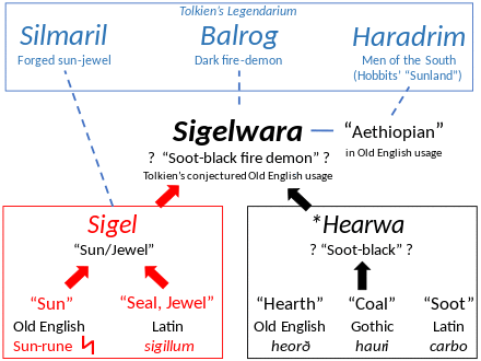 Tolkien was interested in particular in the Old English word used for "Aethiopians": it was Sigelwara, or in Tolkien's emendation Sigelhearwan.[14] The critic Tom Shippey writes that Tolkien's philological research, described in his essay "Sigelwara Land",[T 19] began from the assumption that the word could not originally have meant Aethiopian, but must have been co-opted to that usage having once meant something comparable. Tolkien approached the question by analysing the two parts of the word. Sigel meant, according to Tolkien, "both sun and jewel", the former as it was the Old English name of the Sun rune *sowilō (ᛋ), the latter connotation from Latin sigillum, a seal.[13]