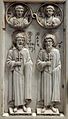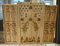 All sides of the triptych are fully carved, with more saints on the outsides of the side leaves, and an elaborate decorative scheme on the back of the central leaf.