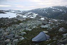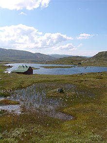 The landscape of the Hardangervidda is characterised by barren, treeless moorland interrupted by numerous pools, lakes, rivers and streams. There are significant differences between the west side, which is dominated by rocky terrain and expanses of bare rock, and the east side, which is much flatter and more heavily vegetated. The climate also varies between the two sides: it is considerably wetter on the west side than on the east, with over 1,000 millimetres (39 in) per year recorded in some parts.[4] The prominent peak of Hårteigen 1,690 m (5,545 ft) is visible across much of the plateau.[5][6]