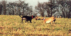 Since the introduction of muzzling for greyhounds in 1993, deaths to hares are less common, falling from an average of 16% to about 4% of hares coursed (reducing to around 150–200 hares per year). Muzzled dogs are more likely to buffet a hare than to bite it, a factor that may still affect the hare's subsequent survival.[26] Hares can either die due to injuries sustained by contact with the much larger dogs or due to capture myopathy.[66] The report from the official Countryside ranger at the Wexford Coursing Club meeting in December 2003 confirms that, exceptionally, 40 hares died at the event and the report of the veterinary surgeon who examined the hares blames the "significant stress" of being "corralled and coursed".[67] Coursing supporters deny that hare coursing is cruel and say that hares that are injured, pregnant or ill are not allowed to run. Hares are reported to be examined by a vet before and after racing.[28]