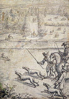 The competitive version of hare coursing was given definitive form[5] when the first complete set of English rules, known as the Laws of the Leash, was drawn up in the reign of Elizabeth I reputedly by Thomas Howard, 4th Duke of Norfolk,[6] providing for a pursuit of no more than two hounds, a headstart termed "Law" to be given to the hare for a fair run, and for the manner of awarding points on "Speed", "Go-bye", "Turn", "Wrench", "Kill" & "Trip", to judge the dogs' performance.[7][8]