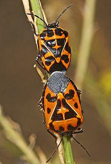The harlequin cabbage bug (Murgantia histrionica), also known as calico bug, fire bug or harlequin bug, is a black stinkbug of the family Pentatomidae, brilliantly marked with red, orange, yellow and white markings. It is a major pest of cabbage and related crops in the Brassicaceae, as well as the ornamental flower cleome throughout tropical and North America, especially the warmer parts of the United States. Nymphs are active during the summer and in the tropics the bug can achieve three to six generations a year. In the northern range there is only one generation annually and the insects overwinter as adults in crop residues or field edges. Organic control involves hand-picking the insects off the plants (they can be dropped into soapy water to drown them) and being especially careful to remove and destroy all the eggs, which are black-and-white striped, laid in clutches of twelve.