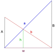 One application of this trapezoid result is in the crossed ladders problem, where two ladders lie oppositely across an alley, each with feet at the base of one sidewall, with one leaning against a wall at height A and the other leaning against the opposite wall at height B, as shown. The ladders cross at a height of h above the alley floor. Then h is half the harmonic mean of A and B. This result still holds if the walls are slanted but still parallel and the "heights" A, B, and h are measured as distances from the floor along lines parallel to the walls. This can be proved easily using the area formula of a trapezoid and area addition formula.
