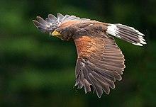 They exhibit sexual dimorphism with the females being larger by about 35%. In the United States, the average weight for adult males is about 701 g (1.545 lb), with a range of 546 to 850 g (1.204 to 1.874 lb), while the adult female average is 1,029 g (2.269 lb), with a range of 766 to 1,633 g (1.689 to 3.600 lb).[8][9] They have dark brown plumage with chestnut shoulders, wing linings, and thighs,[10] white on the base and tip of the tail,[11] long, yellow legs and a yellow cere.[12] The vocalizations of the Harris's hawk are very harsh sounds.[5]