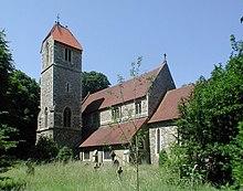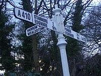 Ancient woodland on high ground fills most of the northern part of Harrow Weald on the border of Greater London (and the traditional county of Middlesex) with Hertfordshire. The area is one of the highest in Greater London; the highest point in Middlesex is near the woods at 502 feet (153 m). The eastern part of the woods merges into those of Stanmore and encompasses Bentley Priory. The priory's grounds are now Bentley Priory Nature Reserve, a biological Site of Special Scientific Interest. Along the southern edge of the high ground runs the road Old Redding and a car park here gives views over parts of London. The western part of the woodland forms Harrow Weald Common, which adjoins Harrow Weald SSSI, a geological Site of Special Scientific Interest. Other smaller woods surround the Grim's Dyke Hotel, the former country house of W. S. Gilbert.[3] Gilbert and Sullivan's comic operas are frequently performed here. The house is named after the nearby earthwork Grim's Ditch, a 3-mile long ancient monument that runs from Harrow Weald to Pinner Green. The monument remains largely mysterious but is known to have been named in the Saxon era.[4] The ditch hints at a long history of habitation in the area and many artefacts have been found on the common to support this.