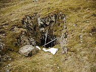The Greenside Mine worked this vein from some time in the 1700s until reserves were exhausted in 1962. The main entrance was in Glenridding at Lucy's Tongue,[8] but an exploratory level was driven into the cliffs at the top of Glencoyne, from just below the Miners' Balcony Path. In 1955 this was incorporated into an emergency back exit from the mine.[11] Alfred Wainwright found the hole, but thought it was just a cave.[1]