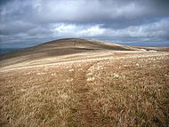 Common Fell at 1,811 feet (552 m) is only 3 feet (0.91 m) lower than Swineside Knott, but is more centrally placed on the ridge and so feels more like its natural summit. It consists of a number of rounded grassy mounds. A small cairn has been built on the highest one, but a remarkable glacial erratic boulder is perched on one of the other mounds. Common Fell gives good views to the north and east.