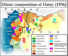 According to the estimates of the French high commission in 1936, out of a population of 220,000 39% were Turks, 28% Arabic-speaking Alawites, 11% Armenians, 10% Sunni Arabs, 8% other Christians and 4% were Circassians, Kurds and Jews. Although Turks formed the largest single ethno-religious minority, Arabic speakers including Sunnis, Alawites and Christians were more numerous.[6]