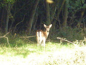 Given the wide range of unspoilt habitats in the Forest, it is not surprising that it has much wildlife, both plant and animal.[14] Amongst mammals to be seen at the Forest are fallow deer, muntjac deer, fox, grey squirrel, rabbit, weasel and hedgehog. There are badger setts, but badgers, being nocturnal are rarely seen. Two herds of Red Poll cattle graze the plains in the traditional manner. Sheep are used as ‘conservation grazers’ for areas that have been cleared of scrub. The breeds being used are Speckled Faced Beulah, Wiltshire Horn and Manx Loaghtan.