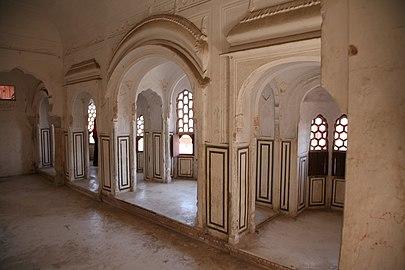 This palace is a five-story pyramidal shaped monument that rises to about 50 feet (15 m). The top three floors of the structure have the width of a single room, while the first and second floors have patios in front of them. The front elevation, as seen from the street, is like a honeycomb with small portholes. Each porthole has miniature windows and carved sandstone grills, finials and domes. It gives the appearance of a mass of semi-octagonal bays, giving the monument its unique façade. The inner face on the back side of the building consists of chambers built with pillars and corridors with minimal ornamentation, and reach up to the top floor. The interior of the palace has been described as "having rooms of different coloured marbles, relieved by inlaid panels or gilding; while fountains adorn the centre of the courtyard".[8][9]