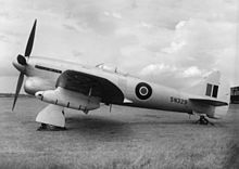 The main undercarriage was redesigned from the Typhoon, featuring lengthened legs and a wider track (16 ft/4.9 m) to improve stability at the high landing speed of 110 mph (177 km/h), and to allow tip clearance for a new de Havilland 14 ft (4.26 m) diameter four-blade propeller. The main undercarriage units were Dowty levered suspension units incorporating trunnions which shortened the legs as they retracted.[44][46] The retractable tailwheel was fully enclosed by small doors and could be fitted with either a plain Dunlop manufactured tyre, or a Dunlop-Marstrand "twin-contact" anti-shimmy tyre.[44]