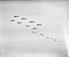 Armed reconnaissance missions were usually flown by two sections (eight aircraft), flying in finger-four formations, which would cross the front lines at altitudes of 7,000 to 8,000 feet: once the Tempests reached their allocated target area the lead section dropped to 4,000 feet or lower to search for targets to strafe, while the other section flew cover 1,000 feet higher and down sun. After the first section had carried out several attacks, it swapped places with the second section and the attacks continued until all ammunition had been exhausted, after which the Tempests would return to base at 8,000 ft.[52] As many of the more profitable targets were usually some 250 miles from base, the Tempests typically carried two 45-gallon drop tanks which were turned on soon after takeoff. Although there were fears that the empty tanks would explode if hit by flak, the threat never eventuated and, due to the tanks being often difficult to jettison, they were routinely carried throughout an operation with little effect on performance, reducing maximum speed by 5 to 10 mph and range by 2 per cent.[52][53]