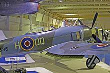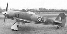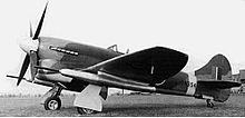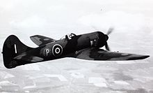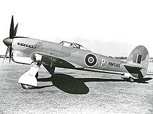 The Hawker Tempest was a British fighter aircraft primarily used by the Royal Air Force (RAF) in the Second World War. The Tempest, originally known as the Typhoon II, was an improved derivative of the Hawker Typhoon, intended to address the Typhoon's unexpected deterioration in performance at high altitude by replacing its wing with a thinner laminar flow design. Since it had diverged considerably from the Typhoon, it was renamed Tempest. The Tempest emerged as one of the most powerful fighters of World War II and was the fastest single-engine propeller-driven aircraft of the war at low altitude.[2]