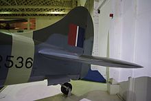 The wing planform was changed to a near-elliptical shape to accommodate the 800 rounds of ammunition for the four 20 mm Hispano cannons, which were moved back further into the wing. The new wing had greater area than the Typhoon's,[nb 2] however, the new wing design sacrificed the leading edge fuel tanks of the Typhoon: to make up for this loss in capacity, Hawker engineers added a new 21 in (53 cm) fuel bay in front of the cockpit, with a 76 Igal (345 l) fuel tank.[4][5] In addition, two inter-spar wing tanks, each of 28 Igal (127 l), were fitted on either side of the centre section and, starting with late model Tempest Vs, a 30 Igal (136 l) tank was carried in the leading edge of the port wingroot, giving the Tempest a total internal fuel capacity of 162 Igal (736 l).[8]