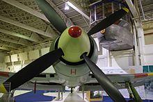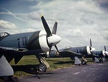 The majority of production Tempests were powered by a single high-powered Napier Sabre II 24-cylinder engine. All versions of the Sabre drove either a four-bladed, 14 ft (4.267 m) diameter de Havilland Hydromatic or Rotol propeller. Starting with EJxxx series, on the Tempest V, both the improved Sabre IIB and IIC were used, these engines were capable of producing over 2,400 hp (1,789 kW) on emergency boost for short periods of time.[44][45] Alternative engines were used on some production variants, such as the Tempest II, for which a single Bristol Centaurus 18 cylinder radial engine was adopted, or the final Tempest VI, upon which a Napier Sabre V was used. Early on in development, the adoption of several other engines was proposed, some of which were tested upon multiple prototypes.[12]