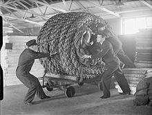 Supply ratings handling a coil of 16 inch towing hawser (rope) at the Royal Navy's Naval Stores Department, Nore, Harwich, which supplies all sea-going ships with the stores and provisions that they need. Note that the coil is bigger than the men and they need a trolley to transport it.