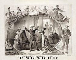 In 1862, the theatre was host to a 400-night run of Our American Cousin, with Edward Sothern as Lord Dundreary. The play's success brought the word "dreary" into common use. Robertson's David Garrick was a hit in 1864, also with Sothern in the title role. Sothern also starred in H. J. Byron's An English Gentleman at the theatre in 1871.[11] W. S. Gilbert premiered seven of his plays at the Haymarket. The first was his early burlesque, Robinson Crusoe; or, The Injun Bride and the Injured Wife (1867, written with Byron, Tom Hood, H. S. Leigh and Arthur Sketchley). Gilbert followed this with a number of his blank verse "fairy comedies", the first of which was The Palace of Truth (1870), produced by Buckstone. These starred William Hunter Kendal and his wife Madge Robertson Kendal and also included Pygmalion and Galatea (1871), and The Wicked World (1873). Gilbert also produced here his dramas, Charity (1874), Dan'l Druce, Blacksmith (1876), and his most famous play outside of his Savoy Operas, Engaged, an 1877 farce.[12] Buckstone's ghost has reportedly often been seen at the theatre, particularly during comedies and "when he appreciates things" playing there.[13] In 2009, The Daily Telegraph reported that the actor Patrick Stewart saw the ghost standing in the wings during a performance of Waiting for Godot at the Haymarket.[13] In May 1875, Arthur Sullivan's The Zoo transferred to the Haymarket.[14]