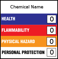 The four bars are color-coded, using the modern color bar symbols with blue indicating the level of health hazard, red for flammability, orange for a physical hazard, and white for Personal Protection. The number ratings range from 0 to 4.