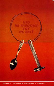 In the USSR work is a duty and a matter of honor for every able-bodied citizen, in accordance with the principle: "He who does not work, neither shall he eat".