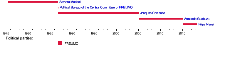 | 4 | Filipe Nyusi (born 1959) | 15 January 2015 | Incumbent | 6 years, 30 days | FRELIMO | 2014 2019 | |