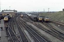 A depot was not built at the yard to accommodate steam trains, but in June 1966, one was built for diesel locomotives.[22] It was the first built by the Eastern Region of British Rail that was not associated with, or had replaced, an existing steam shed, although it was coded 56B under Wakefield Shed.[23] Steam trains had previously been supplied by Wakefield Shed (56A), which then closed in 1967.[24] The last steam trains on British Rail were operating from Rose Grove depot in Lancashire in August 1968. This brought a daily steam locomotive hauled train from Rose Grove to Healey Mills.[25] Diesel shunters operating in the yard before the diesel depot was built, had to run to Hammerton Street depot in Bradford for servicing.[26]