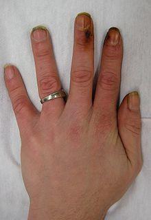 The usage of tobacco has also been linked to Buerger's disease (thromboangiitis obliterans), the acute inflammation and thrombosis (clotting) of arteries and veins of the hands and feet.[87]