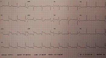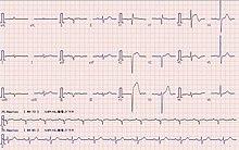 ECG readouts product a waveform with different labelled features.[83] In addition to a rise in biomarkers, a rise in the ST segment, changes in the shape or flipping of T waves, new Q waves, or a new left bundle branch block can be used to diagnose an AMI.[24] In addition, ST elevation can be used to diagnose an ST segment myocardial infarction (STEMI). A rise must be new in V2 and V3 ≥2 mm (0,2 mV) for males or ≥1.5 mm (0.15 mV) for females or ≥1 mm (0.1 mV) in two other adjacent chest or limb leads.[19][24] ST elevation is associated with infarction, and may be preceded by changes indicating ischemia, such as ST depression or inversion of the T waves.[83] Abnormalities can help differentiate the location of an infarct, based on the leads that are affected by changes.[16] Early STEMIs may be preceded by peaked T waves.[19] Other ECG abnormalities relating to complications of acute myocardial infarctions may also be evident, such as atrial or ventricular fibrillation.[84]