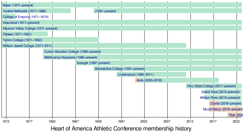 In early 2014, Grand View University and William Penn University were announced as members for the 2015–16 school year.[3] In April 2015, Clarke University and Mount Mercy University were also announced as members for the 2016–17 school year.[4] In October 2019, Park University was approved for HAAC membership and joined in the 2020–21 school year.[5]