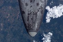 - A thermal soak heat shield uses an insulating material to absorb and radiate the heat away from the spacecraft structure. This type was used on the Space Shuttle, consisting of ceramic or composite tiles over most of the vehicle surface, with reinforced carbon-carbon material on the highest heat load points (the nose and wing leading edges). Damage to this material on a wing caused the 2003 Space Shuttle Columbia disaster.