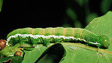 The larva are green dotted all over with yellow; dorsal and subdorsal lines yellowish white; spiracular line broad, white, with dark upper edge; head pale green. It feeds on a wide variety of plants (see list below). This species overwinters as a pupa.