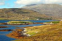 Lewis and Harris is the largest island in Scotland and the third largest of the British Isles, after Great Britain and Ireland.[19] It incorporates Lewis in the north and Harris in the south, both of which are frequently referred to as individual islands, although they are joined by a land border. The island does not have a single common name in either English or Gaelic and is referred to as "Lewis and Harris", "Lewis with Harris", "Harris with Lewis" etc. For this reason it is treated as two separate islands below.[20] The derivation of Lewis may be pre-Celtic (see above) and the origin of Harris is no less problematic. In the Ravenna Cosmography, Erimon may refer to Harris[21] (or possibly the Outer Hebrides as a whole). This word may derive from the Ancient Greek: ἐρῆμος (erimos "desert".[22] The origin of Uist (Old Norse: Ívist) is similarly unclear.[15]